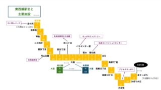 地域振興 札幌の基点 札幌市の中心部は、ほぼ碁盤の目になっています。中央には、大通(おおどおり)という道路が東西に走っており、この通りを起点に北側は北1条通、北2条通、と北側へ行くごとに条の前の数字が増えていき、東西を分けているのは、南北に流れる創成川です。川沿いの創成川通りより東は、東1丁目、東2丁目、となり東30丁目まであります 2025.12.03 2025.12.04 地域振興札幌市街地-地上編